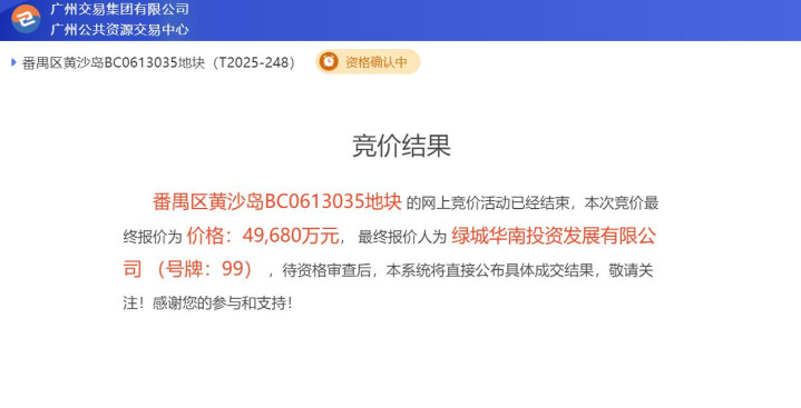 10月21日,番禺区黄沙岛BC0613035地块竞价出让,历经近一个小时、16轮报价后,被绿城以总价49680万元拿下,溢价率约17.8%,折合楼面价2.59万元/㎡。